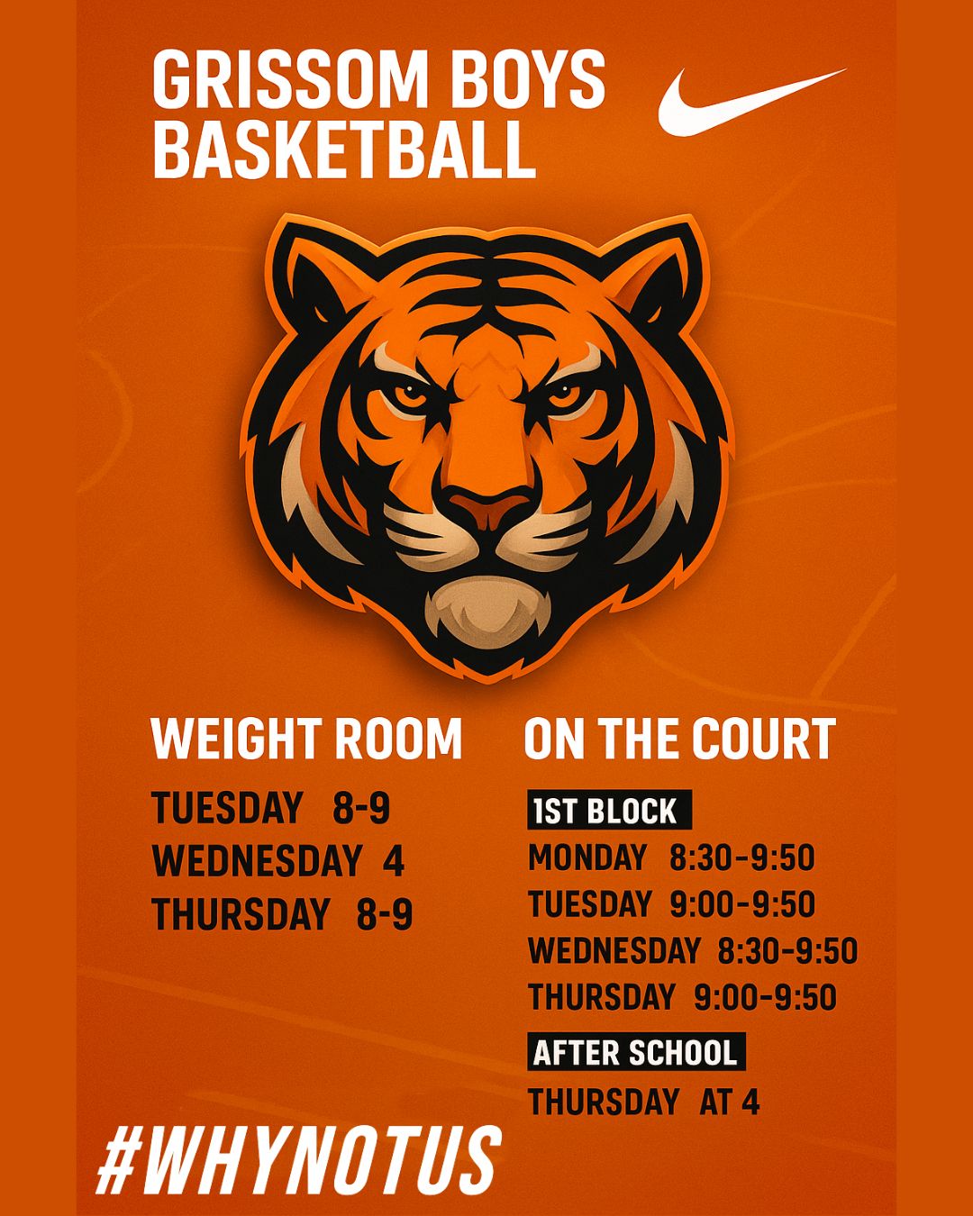 Workouts are conducted in the Main Gym beginning at 2:30 p.m