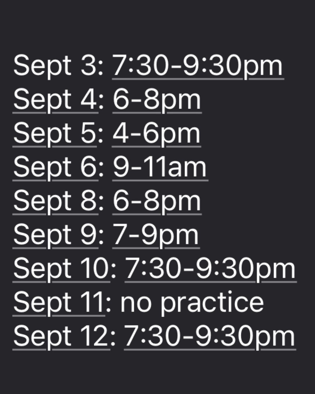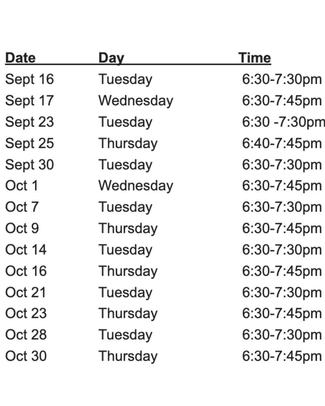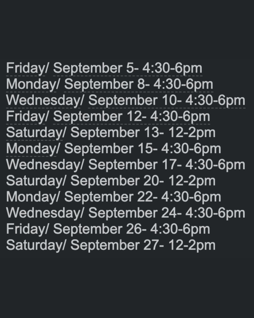 Monday, Wednesday, and Friday in September 4:00pm to 5:30pm