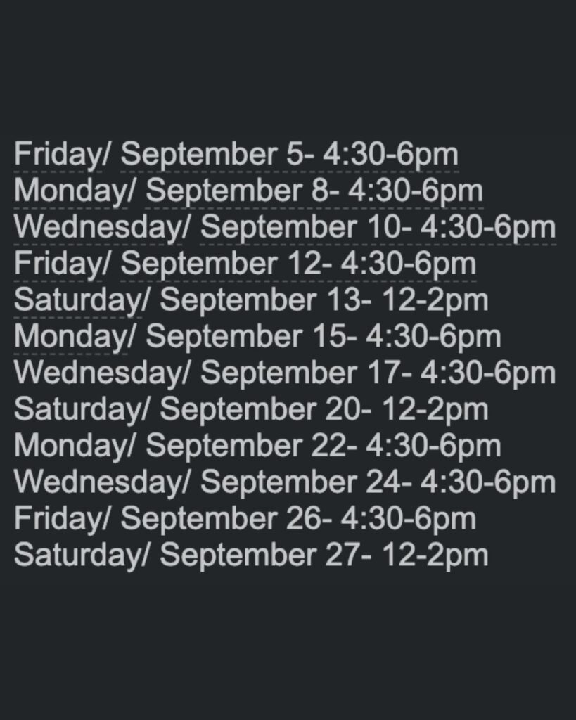 Sept 2, 4, 16, 30. Oct 3 – 3:30-5pm