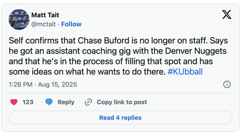 Kansas head coach Bill Self confirmed that assistant coach Chase Buford is leaving the Jayhawks after just one season to join the Denver Nuggets’ staff. Buford, a former Kansas walk-on guard and member of the 2008 national championship team, was hired as an assistant coach in Denver under David Adelman.