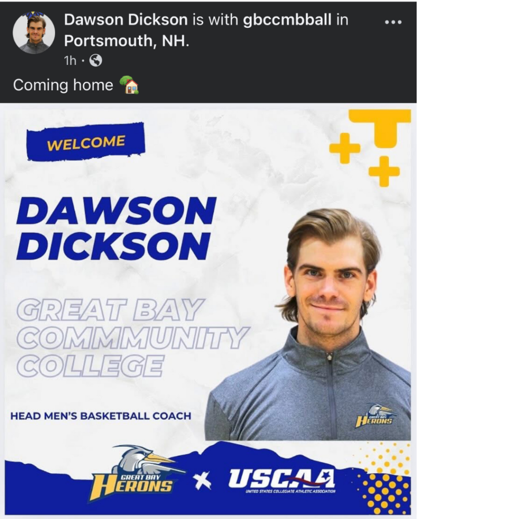 Dawson Dickson has stepped down as the head basketball coach at NJCAA Minnesota State North-Vermillion, and will become the new head coach at USCAA Great Bay Community College (NH).
