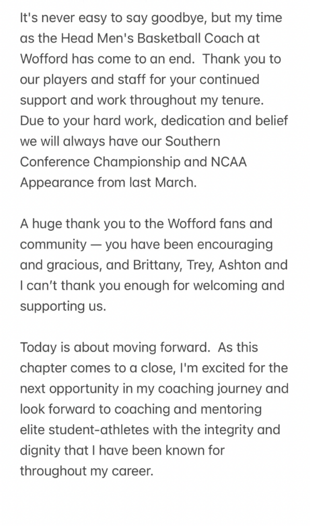 Dwight Perry, who was dismissed as the head men’s basketball coach at Wofford back on September 12th, has issued his first public statement since his release: