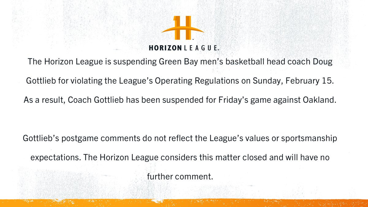 The Horizon League has suspended Green Bay head basketball coach Doug Gottlieb for one game following his outburst on Sunday:
