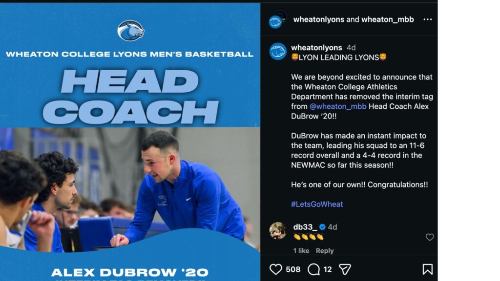 Wheaton College has removed the interim tag from head men’s basketball coach Alex DuBrow. The move was announced via social media earlier this week.