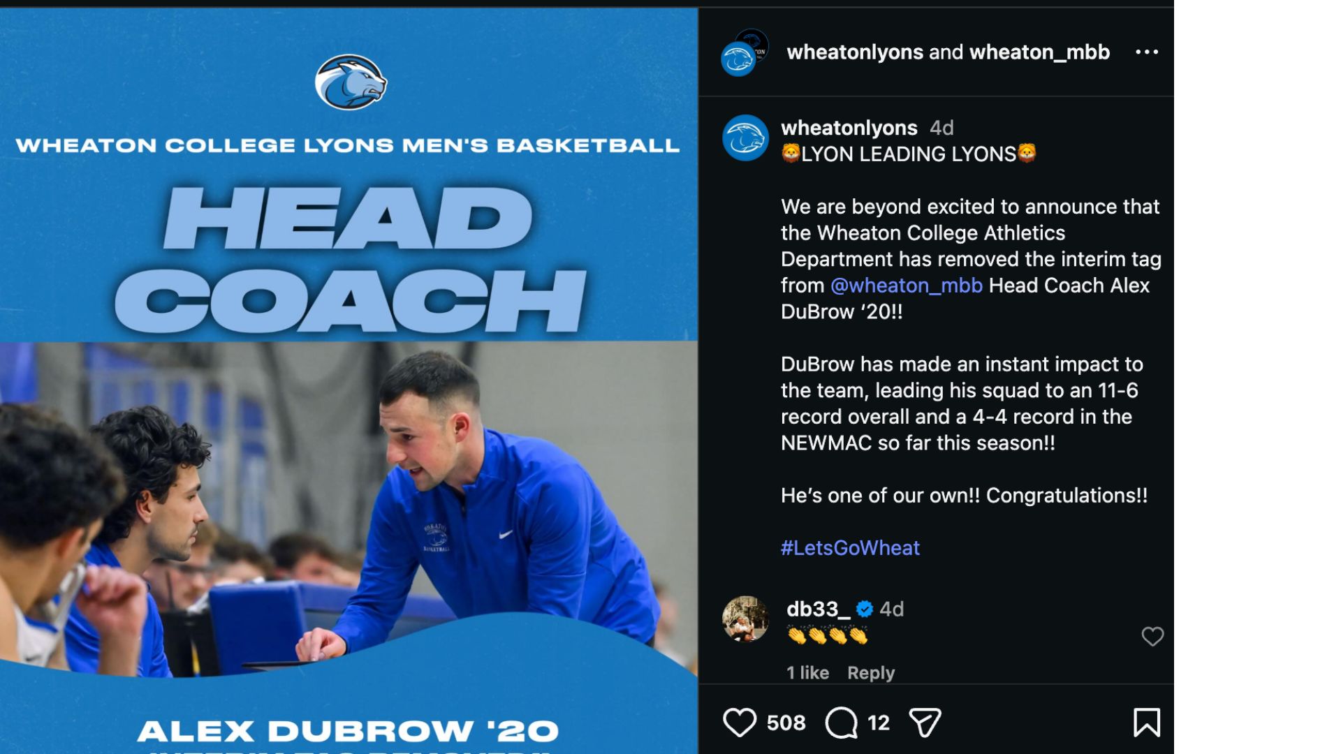 Wheaton College has removed the interim tag from head men’s basketball coach Alex DuBrow. The move was announced via social media earlier this week.